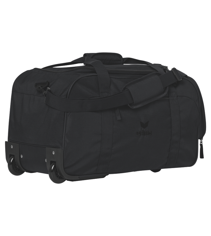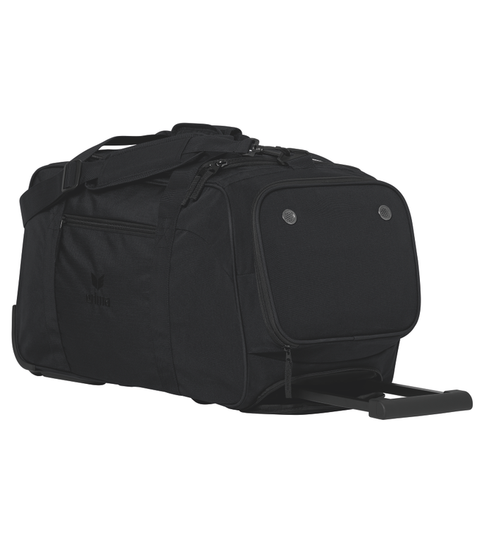 Sportstaske med trolleyfunktion og hjul. ERIMA Trolleybag er den perfekte kombination af stil, funktionalitet og holdbarhed. Tasken er fremstillet i højkvalitets ripstop-materiale, der effektivt forhindrer, at stoffet flænger, og den elegante sorte farve giver et moderne og professionelt udtryk både på rejser og til sport. Den stærke bund i 1680D polyester sikrer ekstra slidstyrke, så du kan stole på, at tasken holder til intensiv brug. Med et rummeligt hovedrum, en praktisk frontlomme med lynlås samt en sidelomme med vådrum og ventilationshuller er organiseringen enkel og effektiv. Indvendigt finder du en integreret mesh-lomme til værdigenstande, hvilket gør tasken ideel som både rejsetaske på hjul og sportstaske med smarte rum.